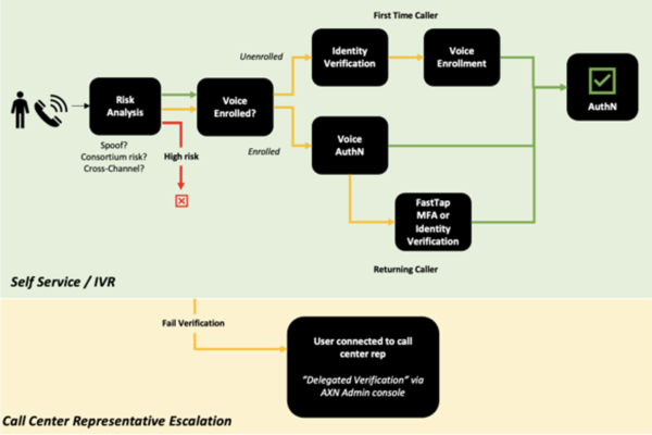 - If the user is enrolled, we authenticate using their voice and device signature. If they pass, they are seamlessly sent to the contact center rep. If they don’t pass, we step them up to an MFA process, once they pass that step, they are sent to the contact center rep, verified and authenticated.